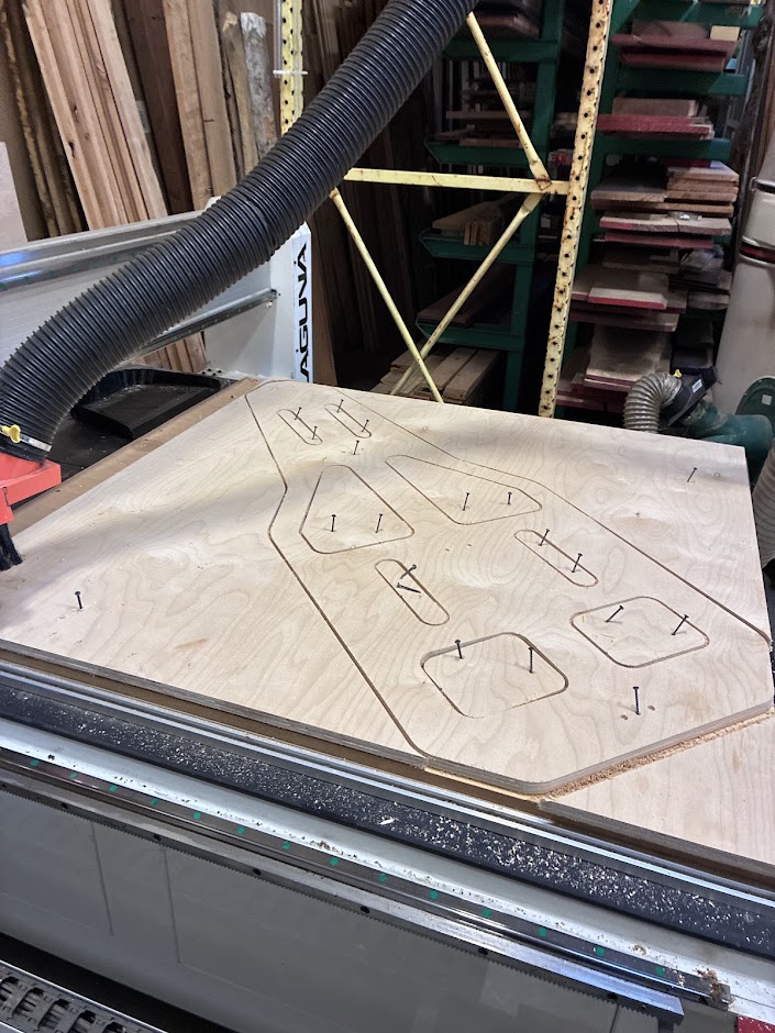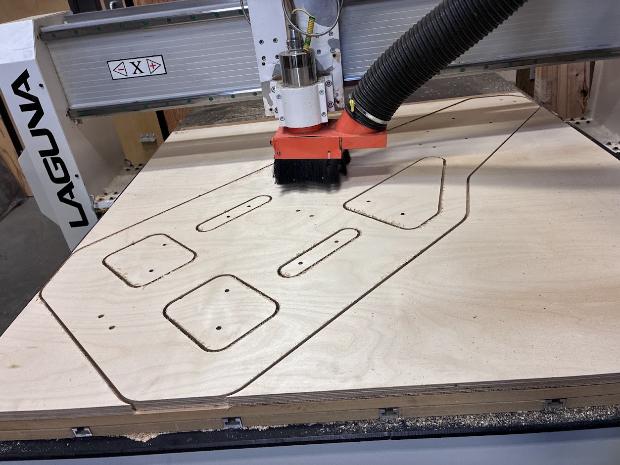 We used Fusion 360 to generate our CAM. I don't have images to show. Needless to say, CAM is an art. Our programs were fairly straightforward. We bought 4x 4'x8' sheets of 3/4" birch, one with low ply for a test run, and 3 with higher ply counts for final plates.